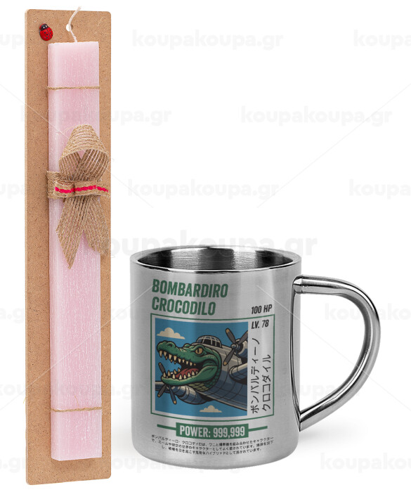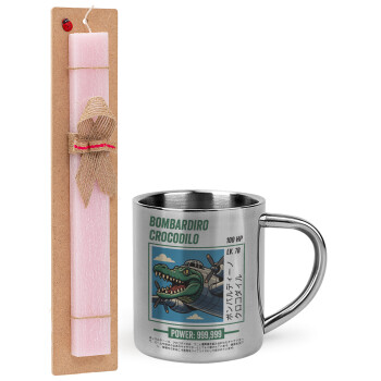 Bombardiro Crocodilo, Easter Set, metallic thermal cup (300ml) & aromatic flat Easter candle (30cm) (PINK)