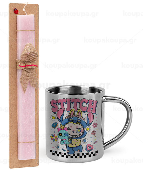 Labubu Stitch, Easter Set, metallic thermal cup (300ml) & aromatic flat Easter candle (30cm) (PINK)