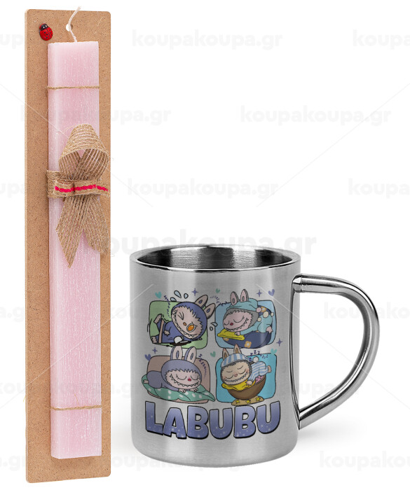 Labubu, Easter Set, metallic thermal cup (300ml) & aromatic flat Easter candle (30cm) (PINK)
