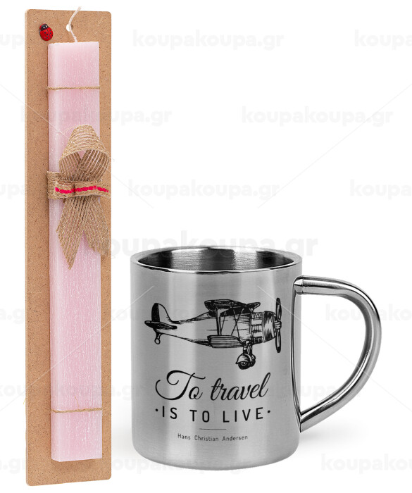 To travel is to live, Easter Set, metallic thermal cup (300ml) & aromatic flat Easter candle (30cm) (PINK)