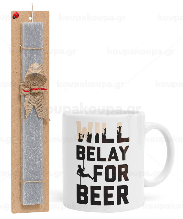 Will Belay For Beer, Easter Set, Ceramic Cup (330ml) & Easter aromatic flat candle (30cm) (GRAY)