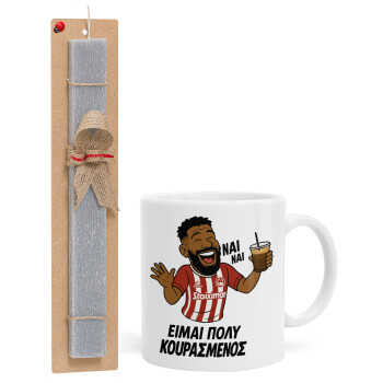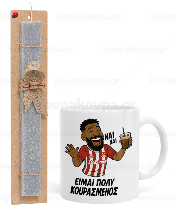 Ροντινέι, "ΠΟΛΥ ΚΟΥΡΑΣΜΕΝΟΣ", Easter Set, Ceramic Cup (330ml) & Easter aromatic flat candle (30cm) (GRAY)