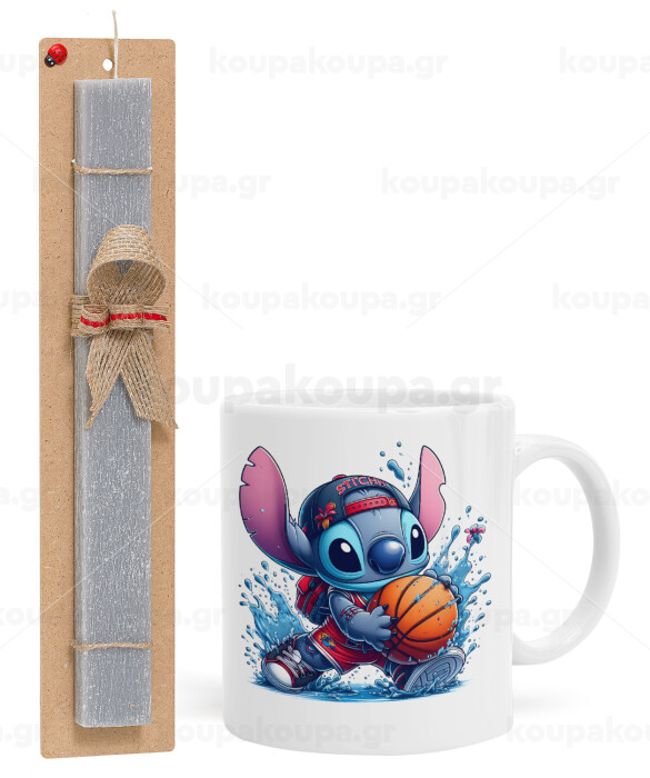 Stitch Basketball, Easter Set, Ceramic Cup (330ml) & Easter aromatic flat candle (30cm) (GRAY)