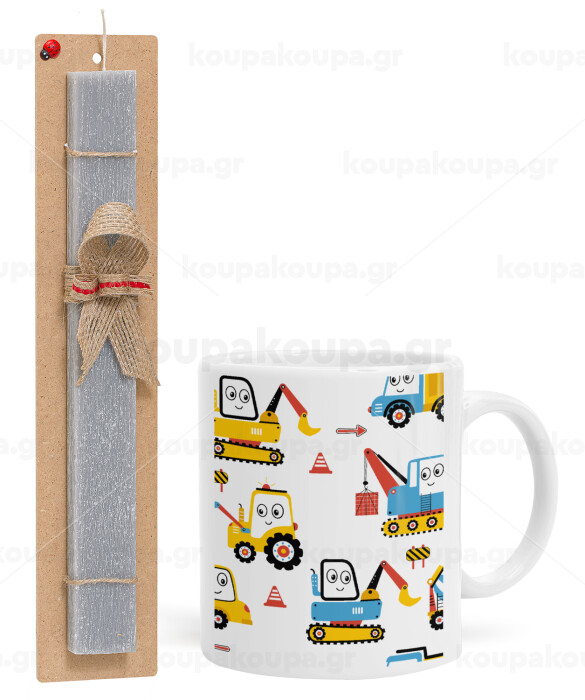 Hand drawing building truck, Easter Set, Ceramic Cup (330ml) & Easter aromatic flat candle (30cm) (GRAY)