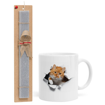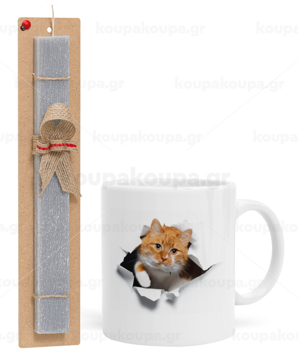 Cat cracked, Easter Set, Ceramic Cup (330ml) & Easter aromatic flat candle (30cm) (GRAY)