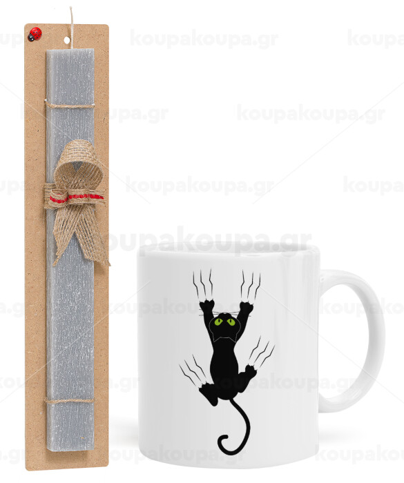 cat grabbing, Easter Set, Ceramic Cup (330ml) & Easter aromatic flat candle (30cm) (GRAY)