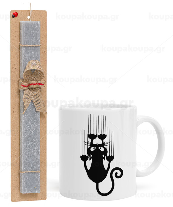 Cat scratching, Easter Set, Ceramic Cup (330ml) & Easter aromatic flat candle (30cm) (GRAY)