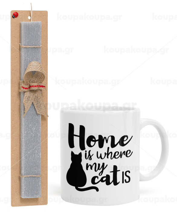 Home is where my cat is!, Easter Set, Ceramic Cup (330ml) & Easter aromatic flat candle (30cm) (GRAY)