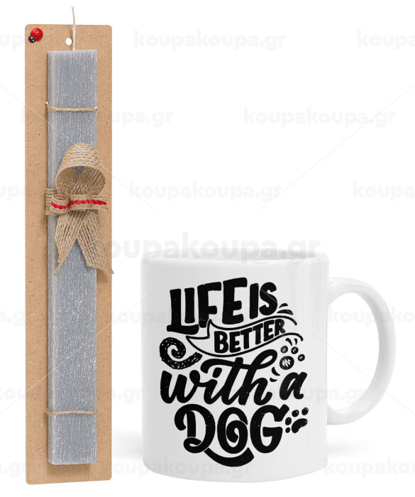 Life is better with a DOG, Easter Set, Ceramic Cup (330ml) & Easter aromatic flat candle (30cm) (GRAY)