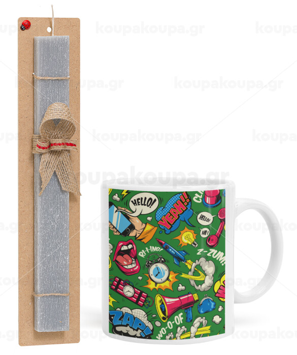 Pop art colorful seamless, Easter Set, Ceramic Cup (330ml) & Easter aromatic flat candle (30cm) (GRAY)