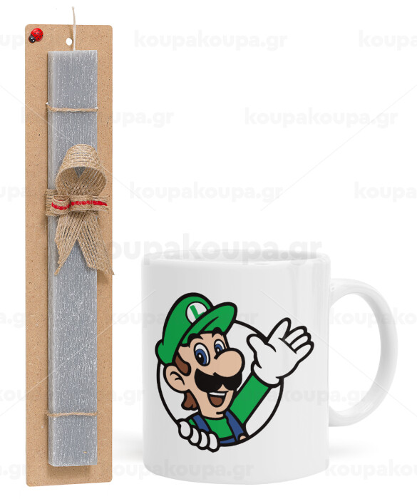 Super mario Luigi win, Easter Set, Ceramic Cup (330ml) & Easter aromatic flat candle (30cm) (GRAY)