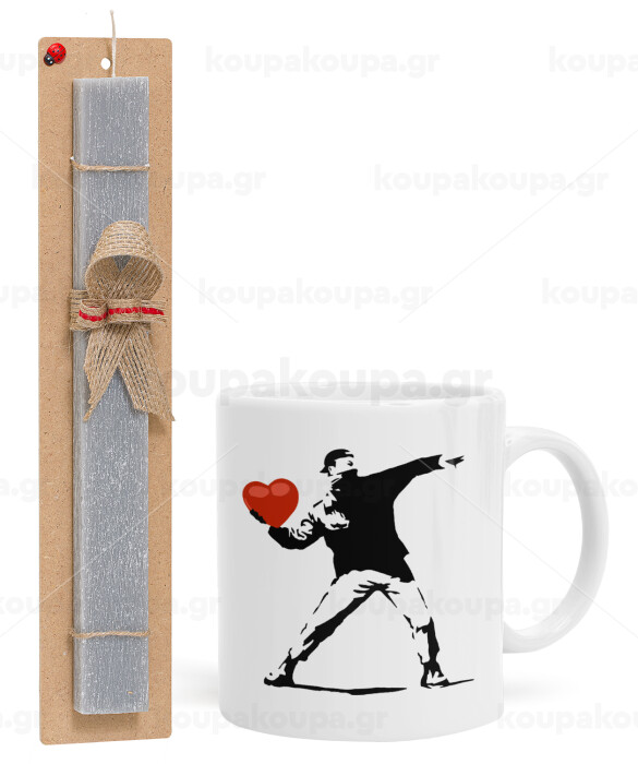 Banksy (The heart thrower), Easter Set, Ceramic Cup (330ml) & Easter aromatic flat candle (30cm) (GRAY)
