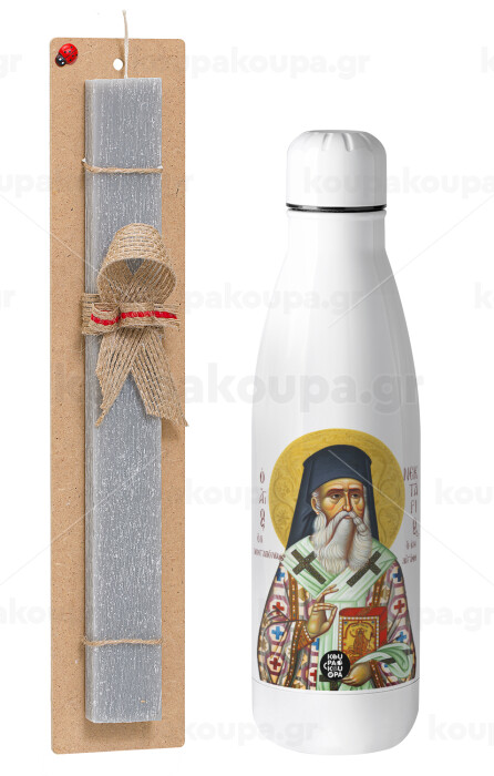 Saint Nektarios, Easter Set, metallic stainless thermos bottle (500ml) & scented flat Easter candle (30cm) (GRAY)
