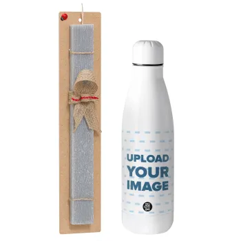 Upload your logo, Easter Set, metallic stainless thermos bottle (500ml) & scented flat Easter candle (30cm) (GRAY)