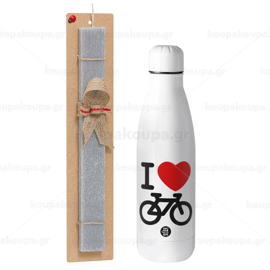 I love Bike, Easter Set, metallic stainless thermos bottle (500ml) & scented flat Easter candle (30cm) (GRAY)