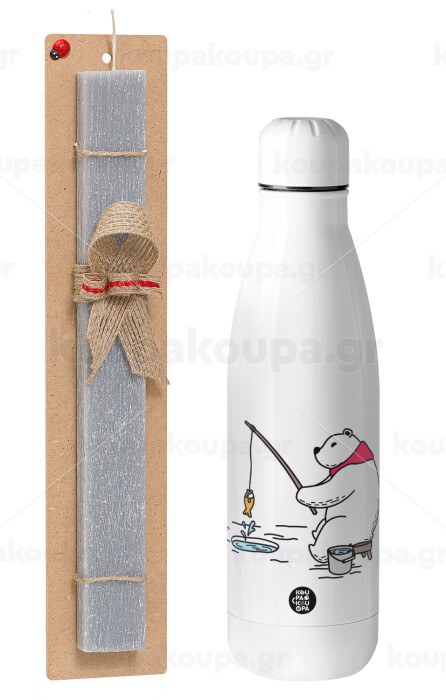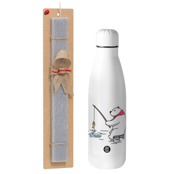 Bear fishing, Easter Set, metallic stainless thermos bottle (500ml) & scented flat Easter candle (30cm) (GRAY)