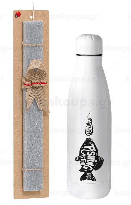 Fishing is fun, Easter Set, metallic stainless thermos bottle (500ml) & scented flat Easter candle (30cm) (GRAY)