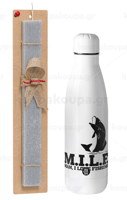 M.I.L.F. Mam i love fishing, Easter Set, metallic stainless thermos bottle (500ml) & scented flat Easter candle (30cm) (GRAY)