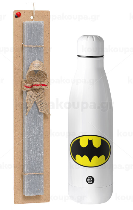 Batman, Easter Set, metallic stainless thermos bottle (500ml) & scented flat Easter candle (30cm) (GRAY)