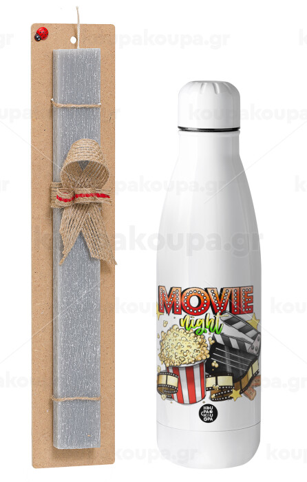 Movie night, Easter Set, metallic stainless thermos bottle (500ml) & scented flat Easter candle (30cm) (GRAY)
