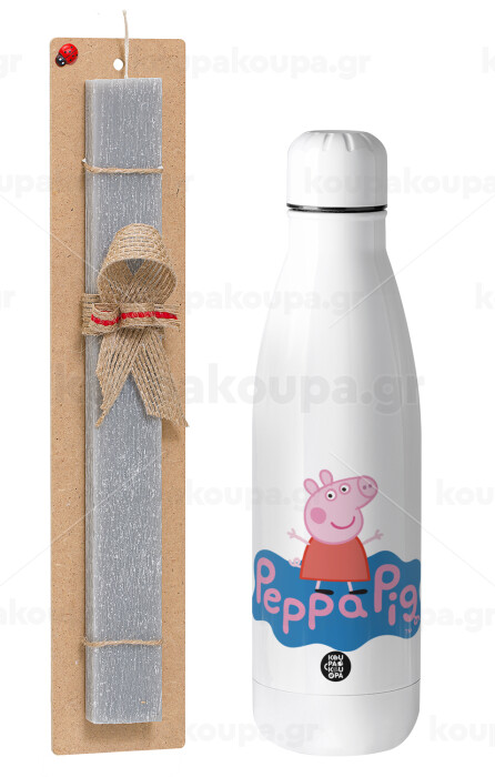 Πέππα το γουρουνάκι μπλε με όνομα, Easter Set, metallic stainless thermos bottle (500ml) & scented flat Easter candle (30cm) (GRAY)