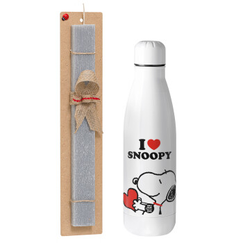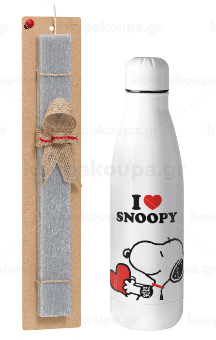 I LOVE SNOOPY, Easter Set, metallic stainless thermos bottle (500ml) & scented flat Easter candle (30cm) (GRAY)