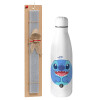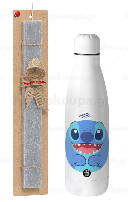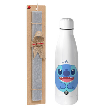 Lilo & Stitch blue, Easter Set, metallic stainless thermos bottle (500ml) & scented flat Easter candle (30cm) (GRAY)