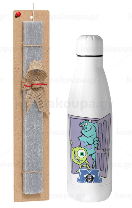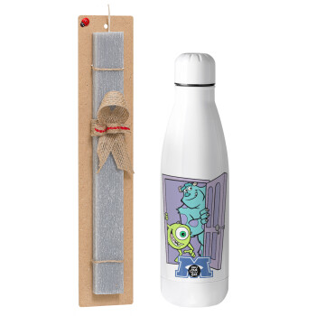 Monster inc, Easter Set, metallic stainless thermos bottle (500ml) & scented flat Easter candle (30cm) (GRAY)