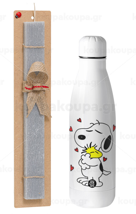Snoopy Love, Easter Set, metallic stainless thermos bottle (500ml) & scented flat Easter candle (30cm) (GRAY)