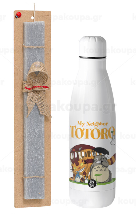 Totoro and Cat, Easter Set, metallic stainless thermos bottle (500ml) & scented flat Easter candle (30cm) (GRAY)