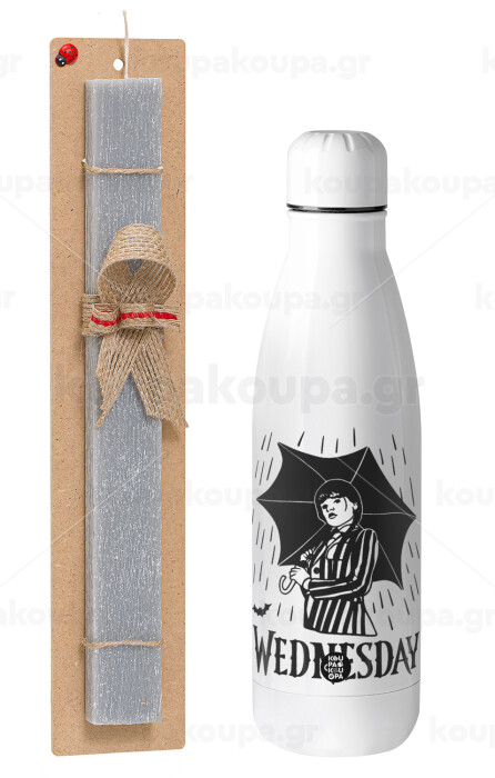 Wednesday Addams, Easter Set, metallic stainless thermos bottle (500ml) & scented flat Easter candle (30cm) (GRAY)