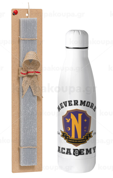 Wednesday Nevermore Academy University, Easter Set, metallic stainless thermos bottle (500ml) & scented flat Easter candle (30cm) (GRAY)