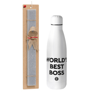World's best boss, Easter Set, metallic stainless thermos bottle (500ml) & scented flat Easter candle (30cm) (GRAY)