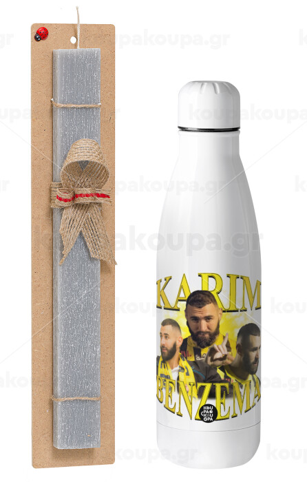 Karim Benzema, Easter Set, metallic stainless thermos bottle (500ml) & scented flat Easter candle (30cm) (GRAY)