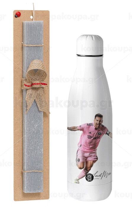 Lionel Messi inter miami jersey, Easter Set, metallic stainless thermos bottle (500ml) & scented flat Easter candle (30cm) (GRAY)