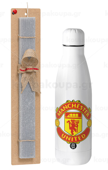 Manchester United F.C., Easter Set, metallic stainless thermos bottle (500ml) & scented flat Easter candle (30cm) (GRAY)