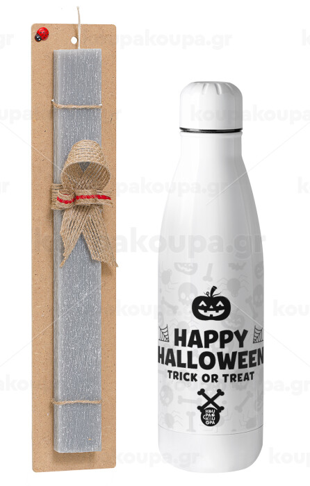 Happy Halloween pumpkin, Easter Set, metallic stainless thermos bottle (500ml) & scented flat Easter candle (30cm) (GRAY)