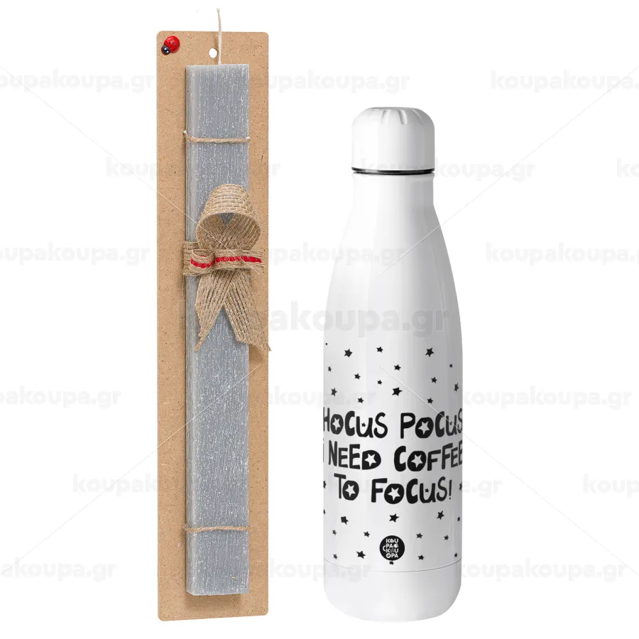 Hocus pocus i need coffee to focus - halloween, Easter Set, metallic stainless thermos bottle (500ml) & scented flat Easter candle (30cm) (GRAY)