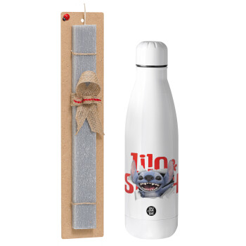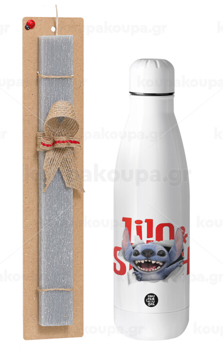 Stitch movie, Easter Set, metallic stainless thermos bottle (500ml) & scented flat Easter candle (30cm) (GRAY)