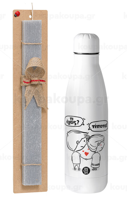 Τι έχεις? Τίποτα!, Easter Set, metallic stainless thermos bottle (500ml) & scented flat Easter candle (30cm) (GRAY)