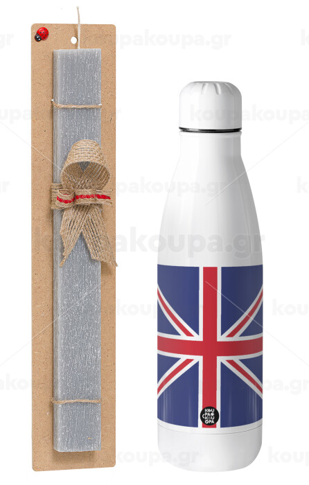 UK Flag, Easter Set, metallic stainless thermos bottle (500ml) & scented flat Easter candle (30cm) (GRAY)