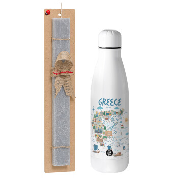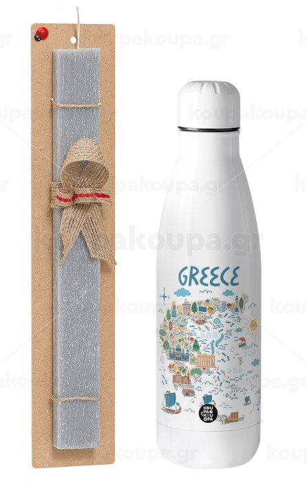 Greek map, Easter Set, metallic stainless thermos bottle (500ml) & scented flat Easter candle (30cm) (GRAY)