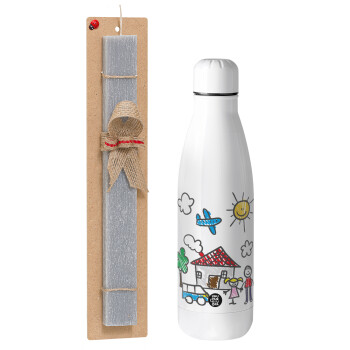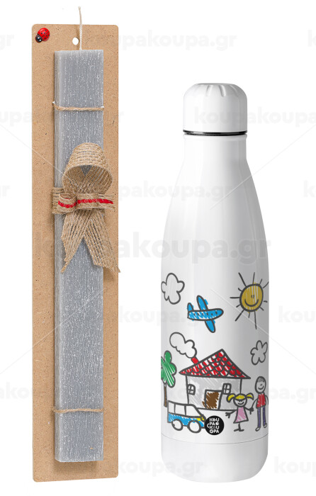 Children's drawing, Easter Set, metallic stainless thermos bottle (500ml) & scented flat Easter candle (30cm) (GRAY)