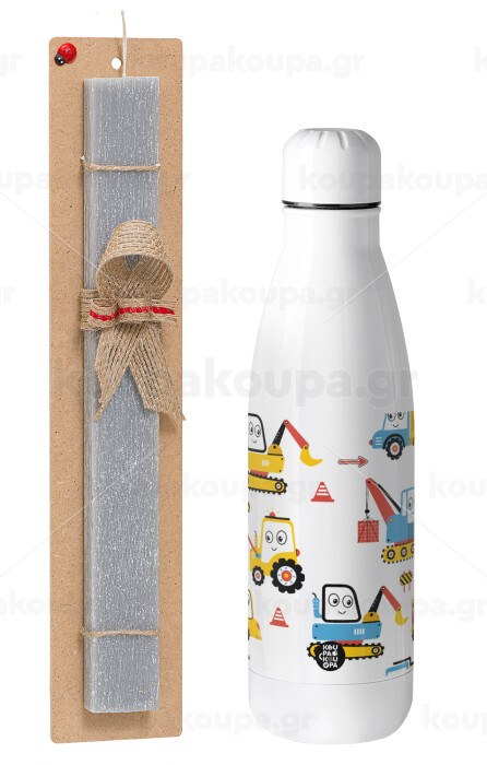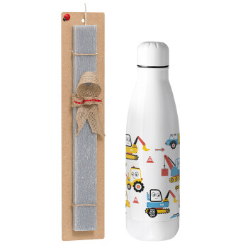 Hand drawing building truck, Easter Set, metallic stainless thermos bottle (500ml) & scented flat Easter candle (30cm) (GRAY)