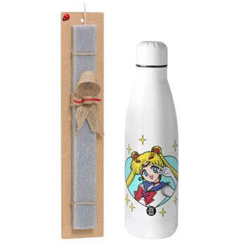 Sailor Moon star, Easter Set, metallic stainless thermos bottle (500ml) & scented flat Easter candle (30cm) (GRAY)