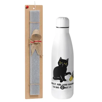 CAT, what are you going to do about it!, Easter Set, metallic stainless thermos bottle (500ml) & scented flat Easter candle (30cm) (GRAY)