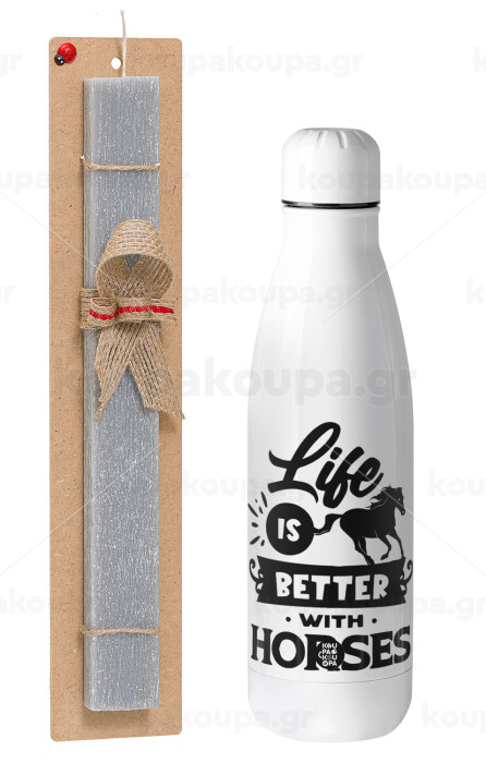 Life is Better with a Horses, Easter Set, metallic stainless thermos bottle (500ml) & scented flat Easter candle (30cm) (GRAY)