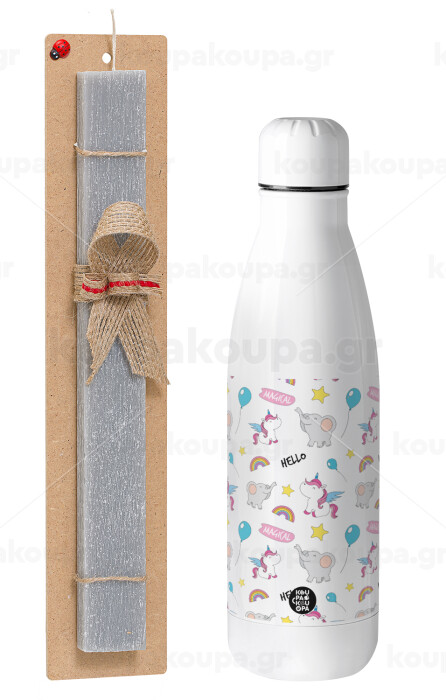 Happy Clouds Doodle, Easter Set, metallic stainless thermos bottle (500ml) & scented flat Easter candle (30cm) (GRAY)