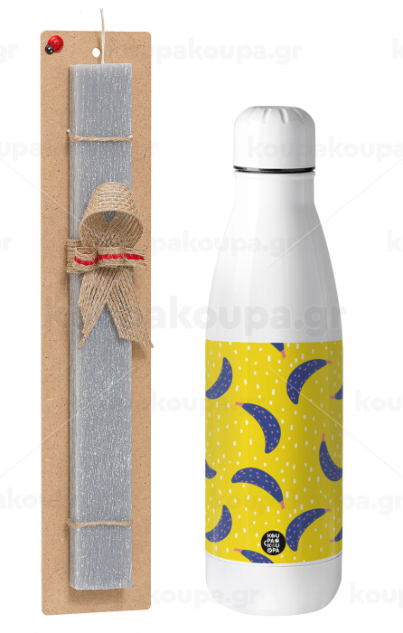 Yellow seamless with blue bananas, Easter Set, metallic stainless thermos bottle (500ml) & scented flat Easter candle (30cm) (GRAY)