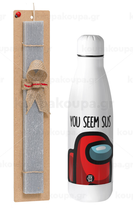 Among US, you seem sus, Easter Set, metallic stainless thermos bottle (500ml) & scented flat Easter candle (30cm) (GRAY)